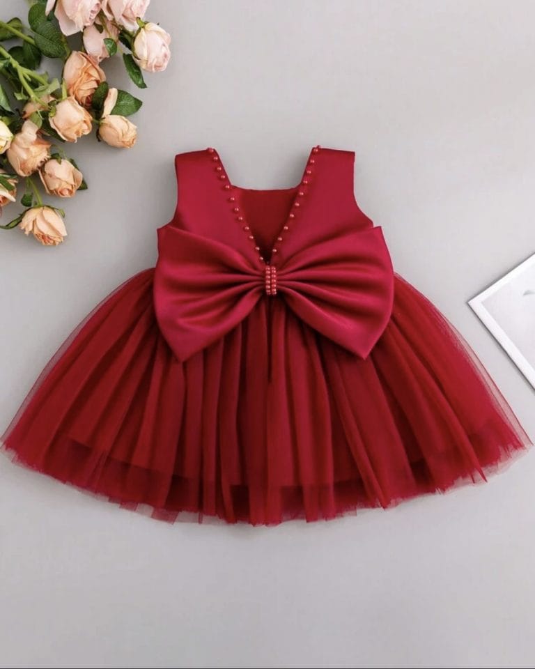 Robe sans manches en Bourgogne pour bébé fille avec gros nœud et décoration en tulle