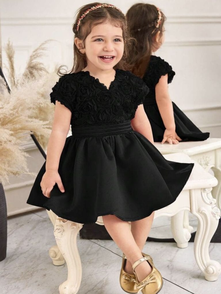 Robe mi-longue élégante ajustée mignonne style palais vintage pour bébé fille, col en V, manches courtes