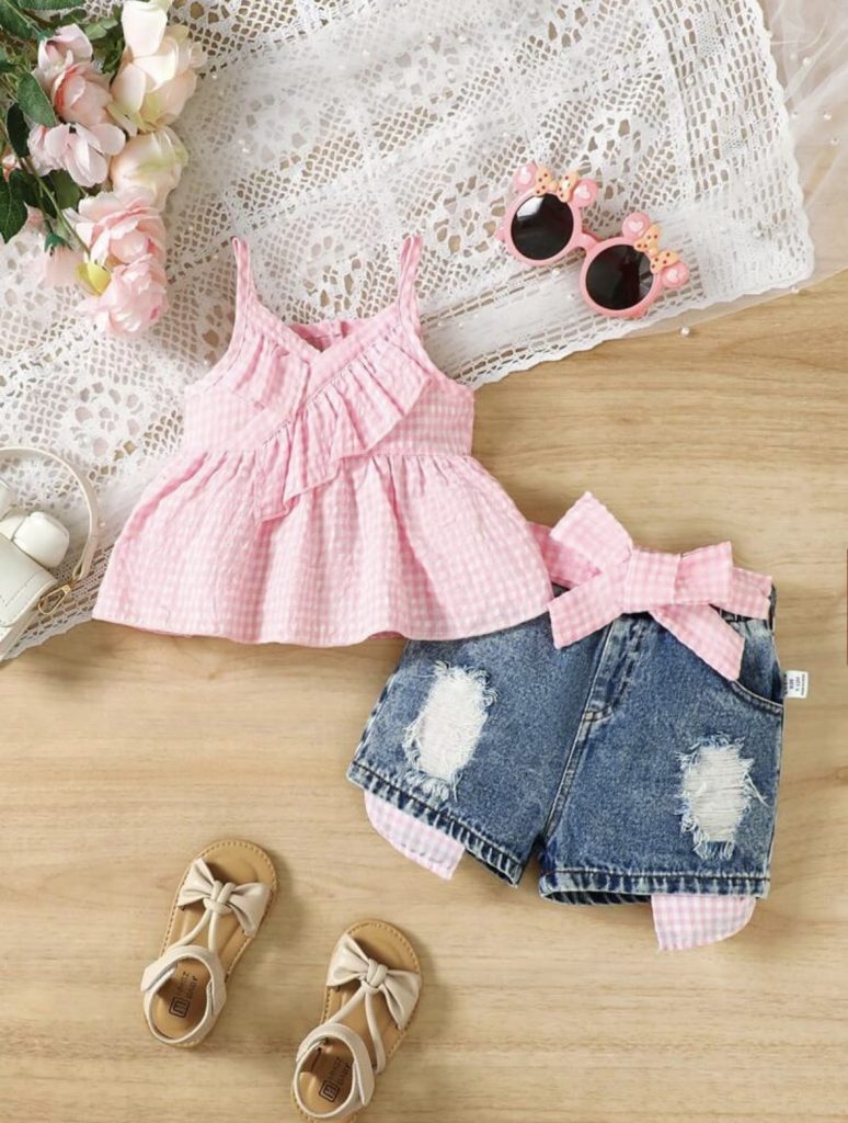 SHEIN 3 pièces Ensemble de top de camisole denœud papillon adorable pour bébé fille, jupe à carreaux avec ourlet à froufrous et bandeau pour fête de vacances d’été