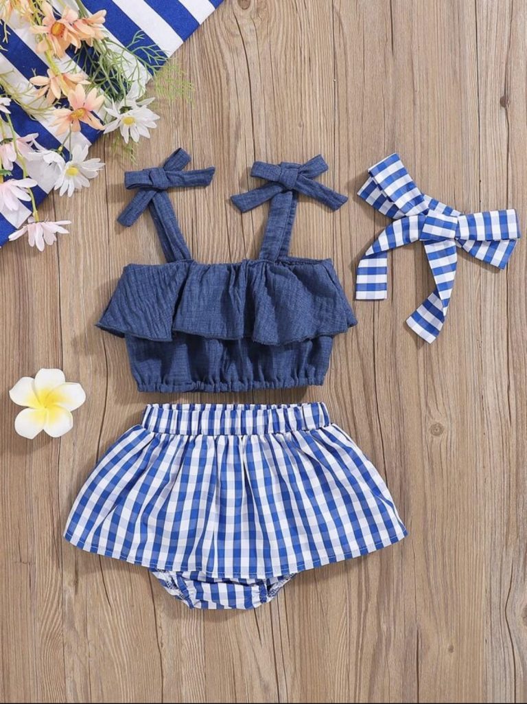 SHEIN 3 pièces Ensemble de top de camisole denœud papillon adorable pour bébé fille, jupe à carreaux avec ourlet à froufrous et bandeau pour fête de vacances d’été