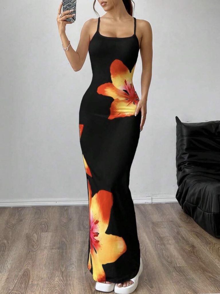 SHEIN EZwear Robe longue aux fines bretelles à imprimé floral élégante pour femme, idéale pour les vacances d’été