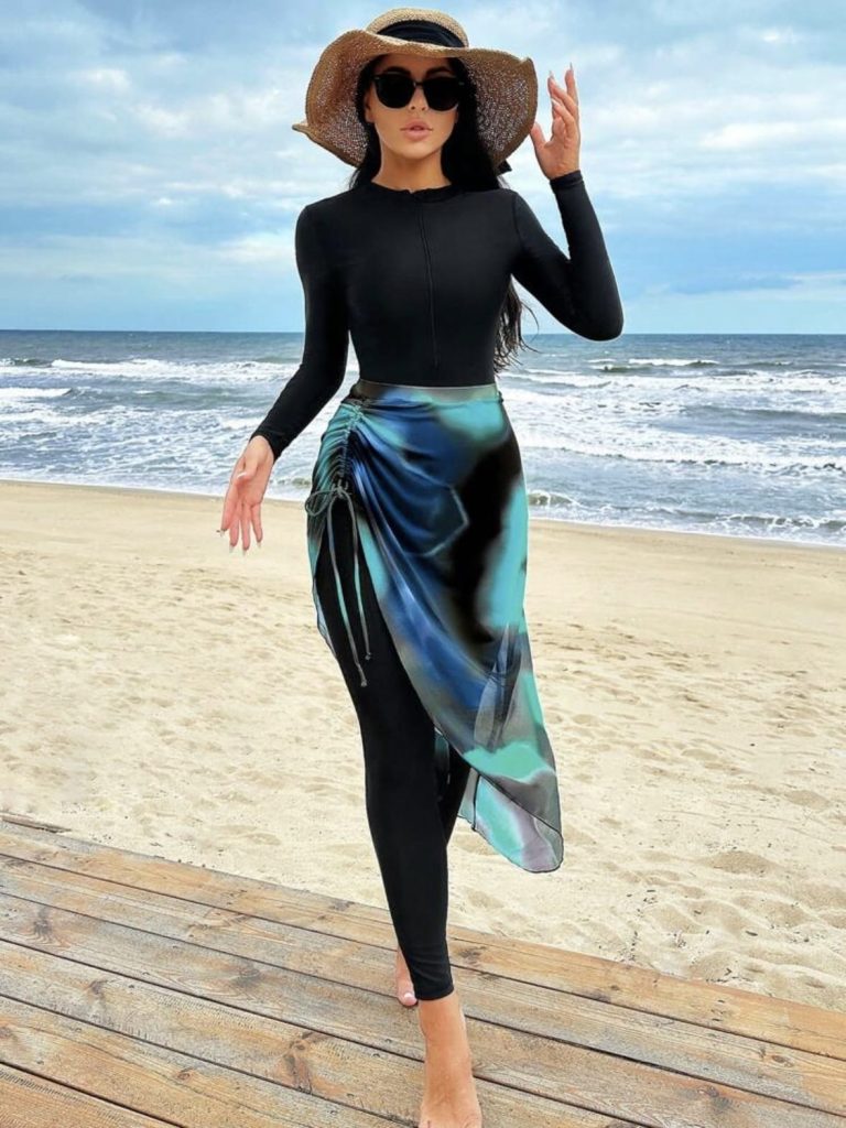 Swim Shayni Femmes Maillot de bain une pièce avec fermeture éclair, pantalon et jupe cache-maillot, motif marbre patchwork bicolore, vêtement d’été pour plage et vacances, style arabe