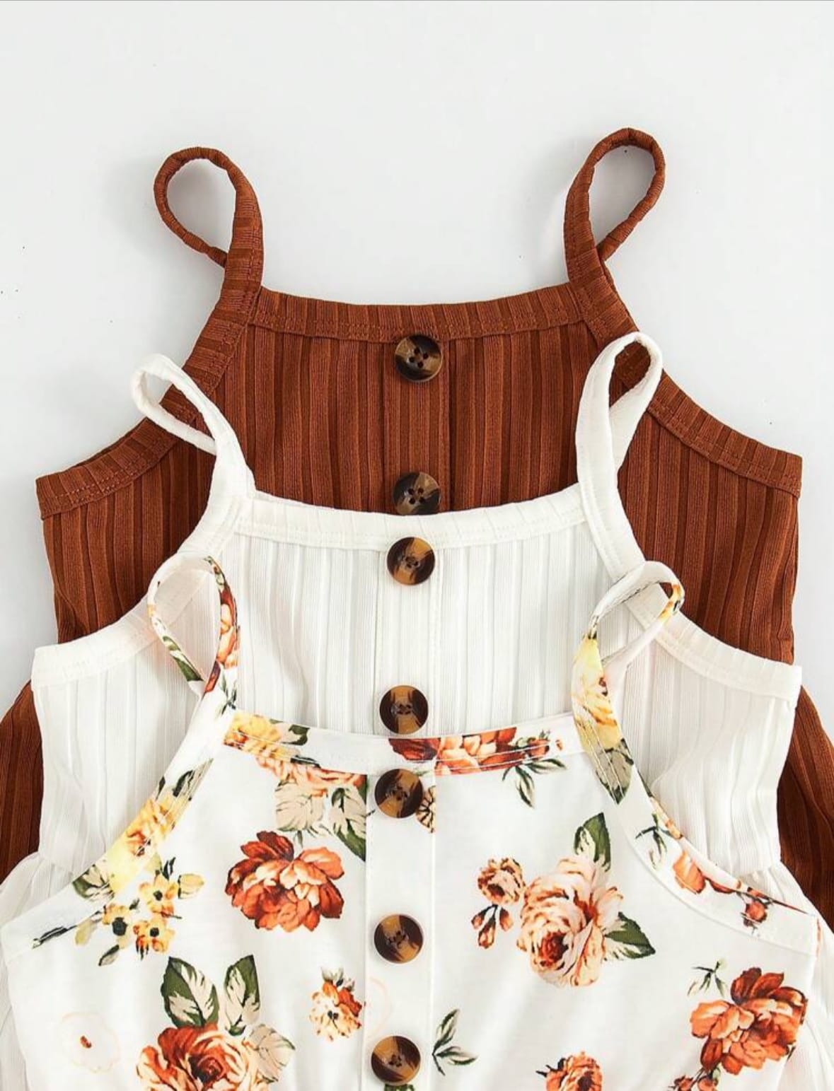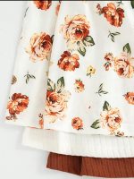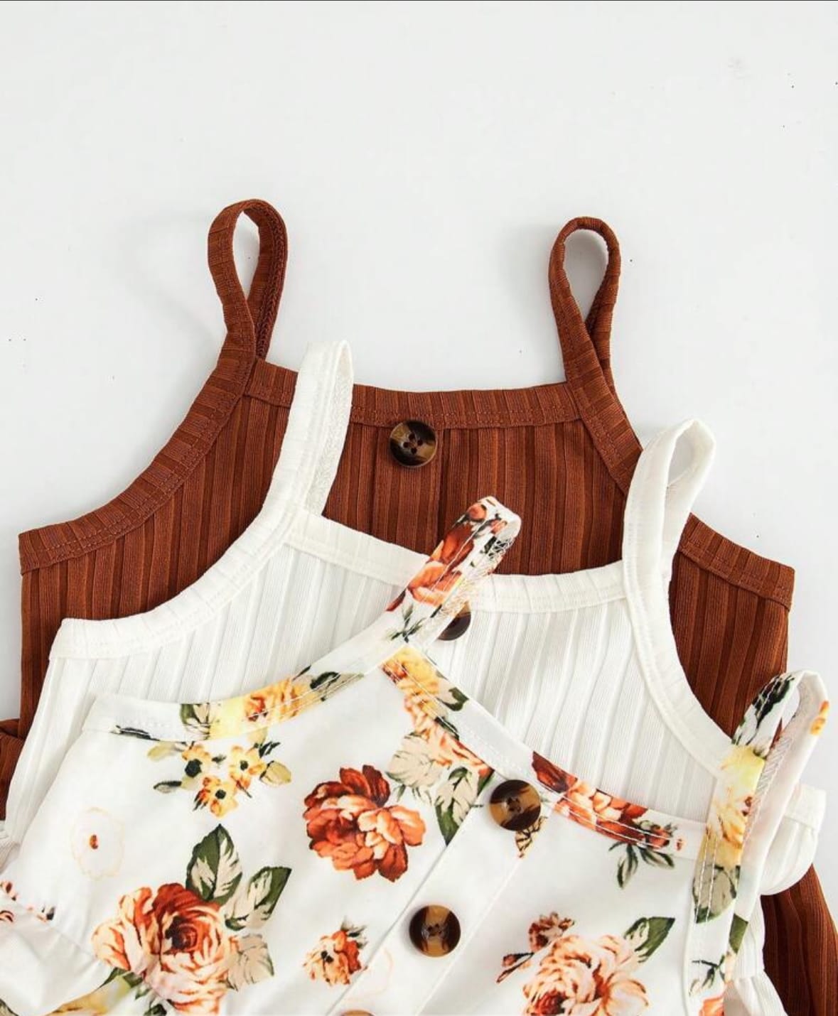 3 pièces Ensemble robe à bretelles boutonnées côtelées de bébé fille avec imprimé floral et unicolore