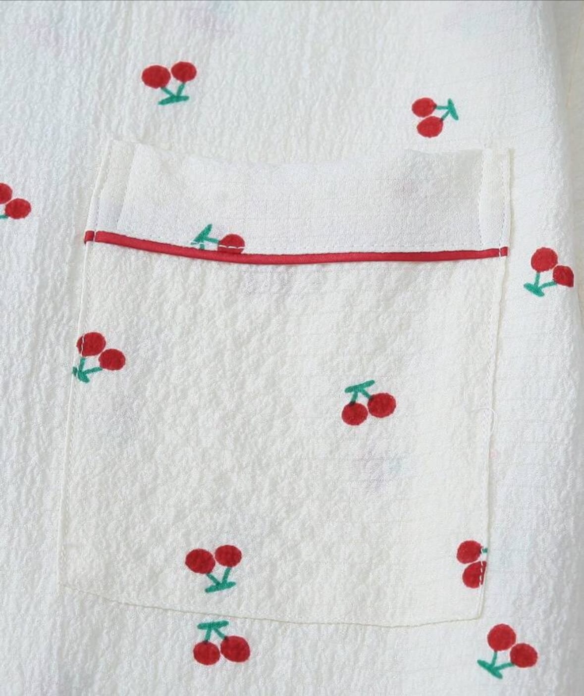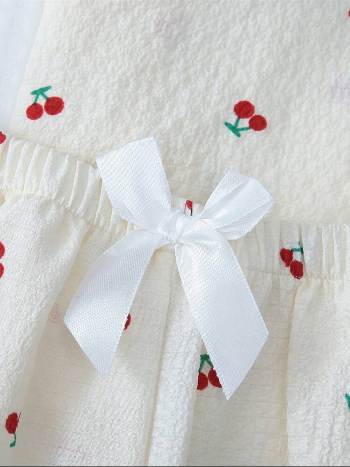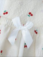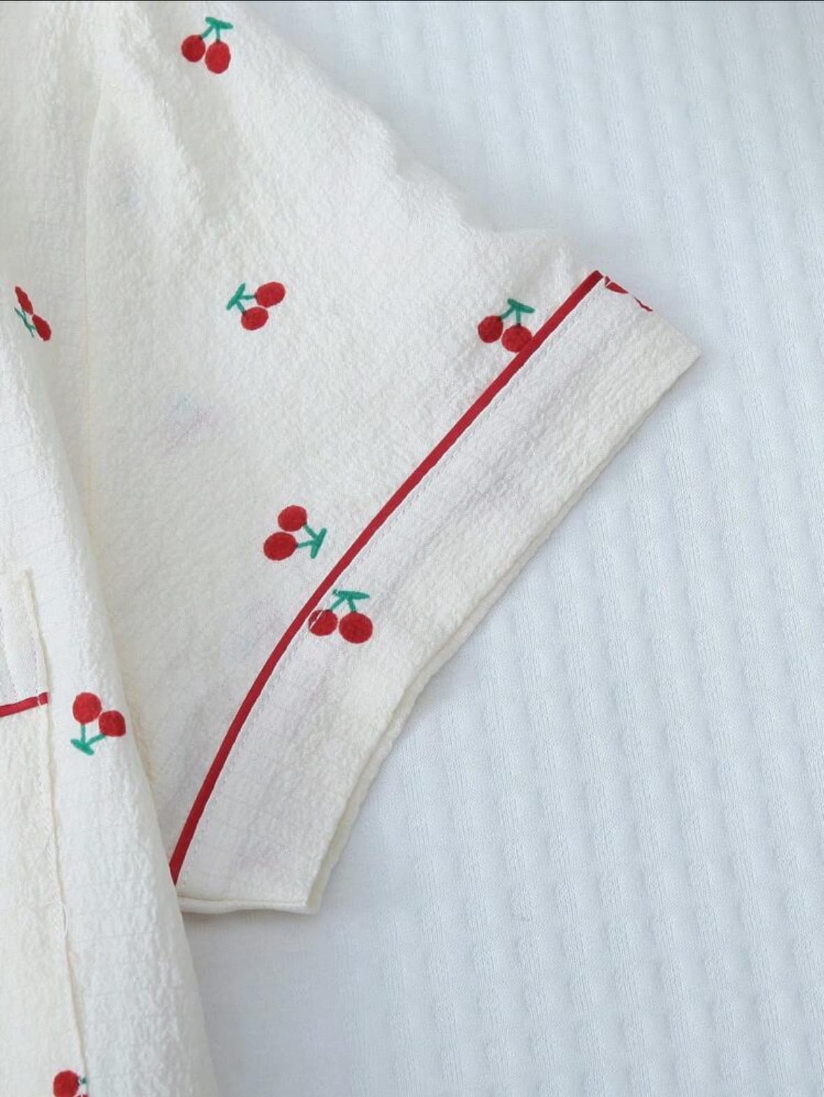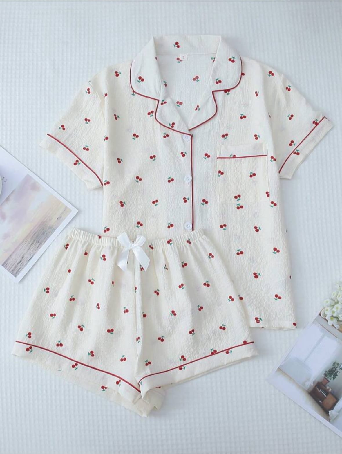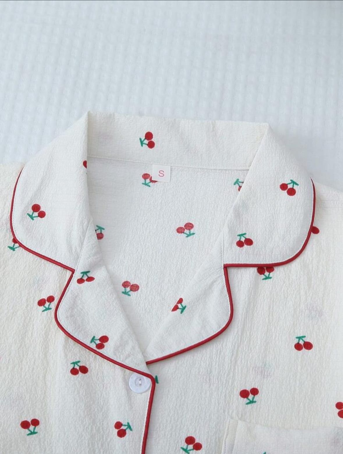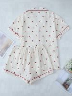 Ensemble De Vêtements De Nuit Doux Imprimé Cerise Avec Haut Boutonné À Col Et Short À nœud Papillon Pour Femmes.