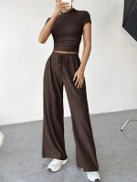 SHEIN EZwear 2 pièces Ensemble Top à manches courtes et pantalon unicolore décontracté pour femmes, printemps et été