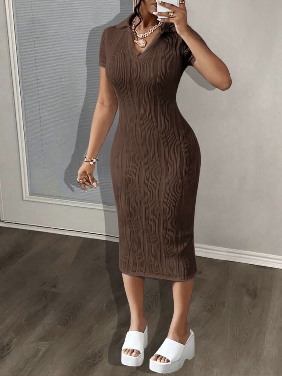 Slaydiva Robe d’été pour femme en tissu tricoté blanc ondulé, modèle slim, col en V, manches courtes, simple et élégante